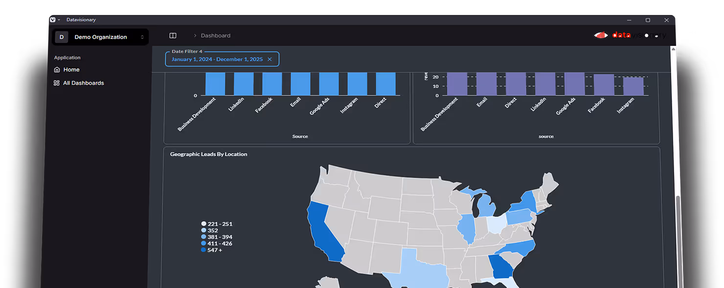 Stop switching tabs or stitching reports together. With 50+ ready-to-go integrations, Data Visionary delivers a single, secure dashboard for every department, from day one.